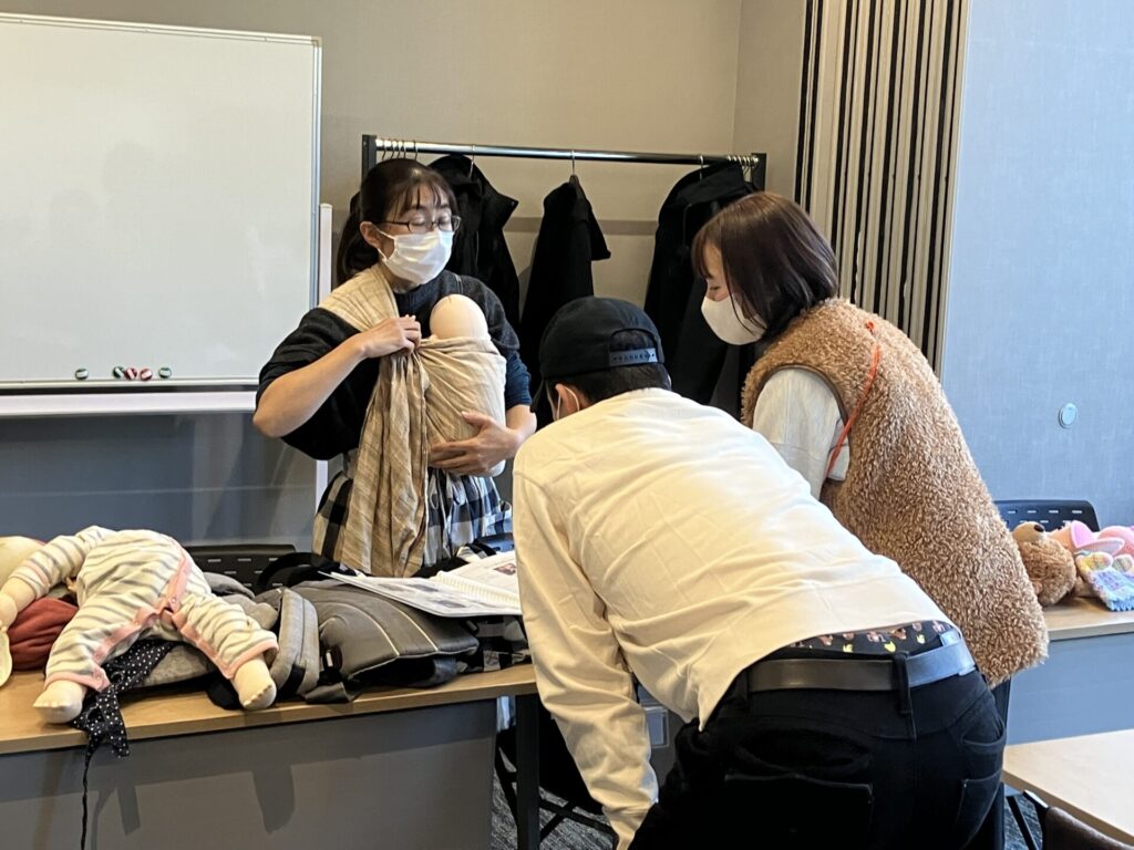 最後は、抱っこのレクチャー、妊婦体験ジャケットを着用した状態での行動を体感していただきました!